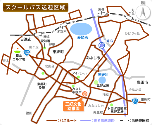 本園では、3台のスクールバスを使用し、以下の地域でのバス送迎を行っています。 送迎に当たっては、時間にゆとりを持ち、バス到着5分前までには送迎地点にお越しください。