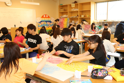 保育現場で実際に使われているいろいろな道具や手法を取り入れた授業。 1つだけのやり方で進むのではなく、創意工夫を楽しみながらいろいろな方法を試すことを覚え、それを幼児に伝えていく方法を学んでいきます。