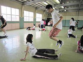 動作、言葉を同時に2人で行う。リズムに乗ってスピードもアップ !! 呼吸がぴったり合い、できた時の爽快感は「気持ちいいー」の一言。