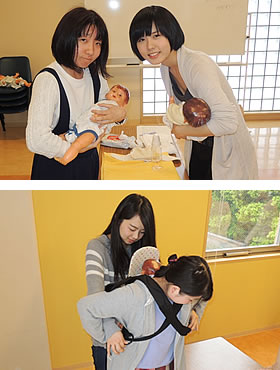 授業に使うこの赤ちゃん人形、実はそれぞれ顔つきや性別も違います。「私の子の方が可愛い !! 」「えー ! この子の方が絶対かわいい !! 」それぞれが楽しみながら0歳児とのかかわりを学んでいました。