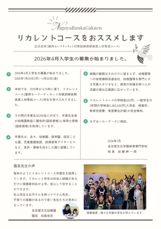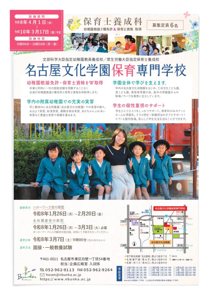 名古屋文化学園保育専門学校は本事業を受託し、幼稚園教諭免許と保育士資格の取得と就職を目指す公共職業訓練(修業年限:昼間2年)を実施いたします。
