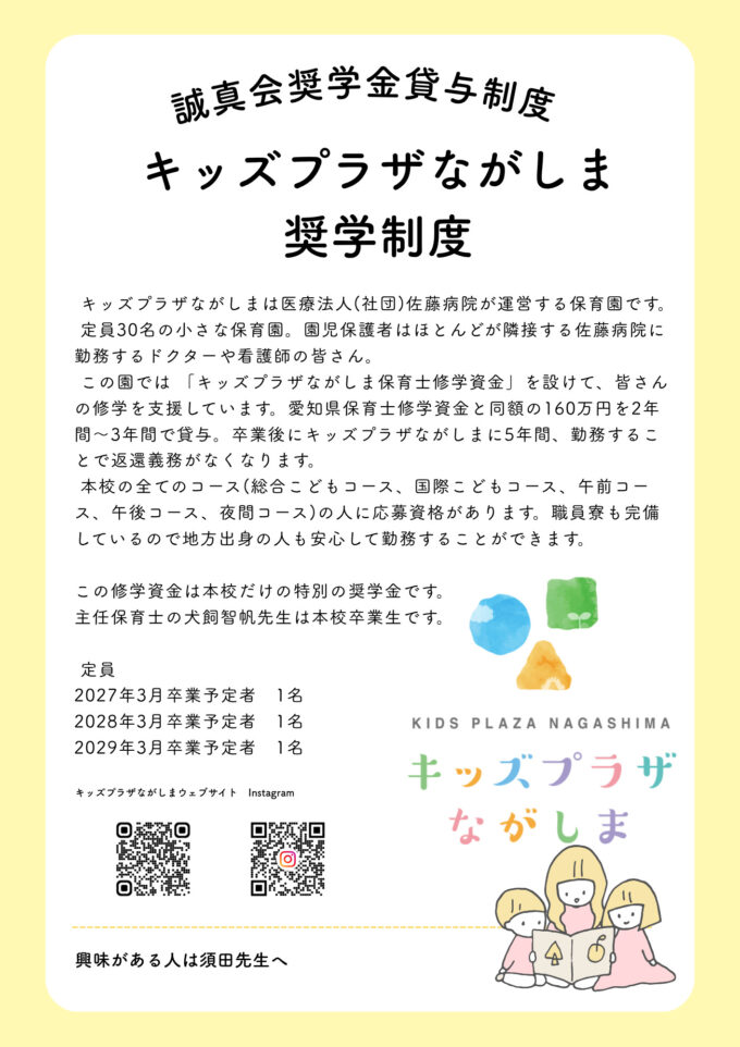 医療法人(社団)佐藤病院が運営する「キッズプラザながしま」では、未来の保育士を目指す皆さんを支援するため、独自の修学資金貸与制度を設けています。(本校の学生のみが対象です)。