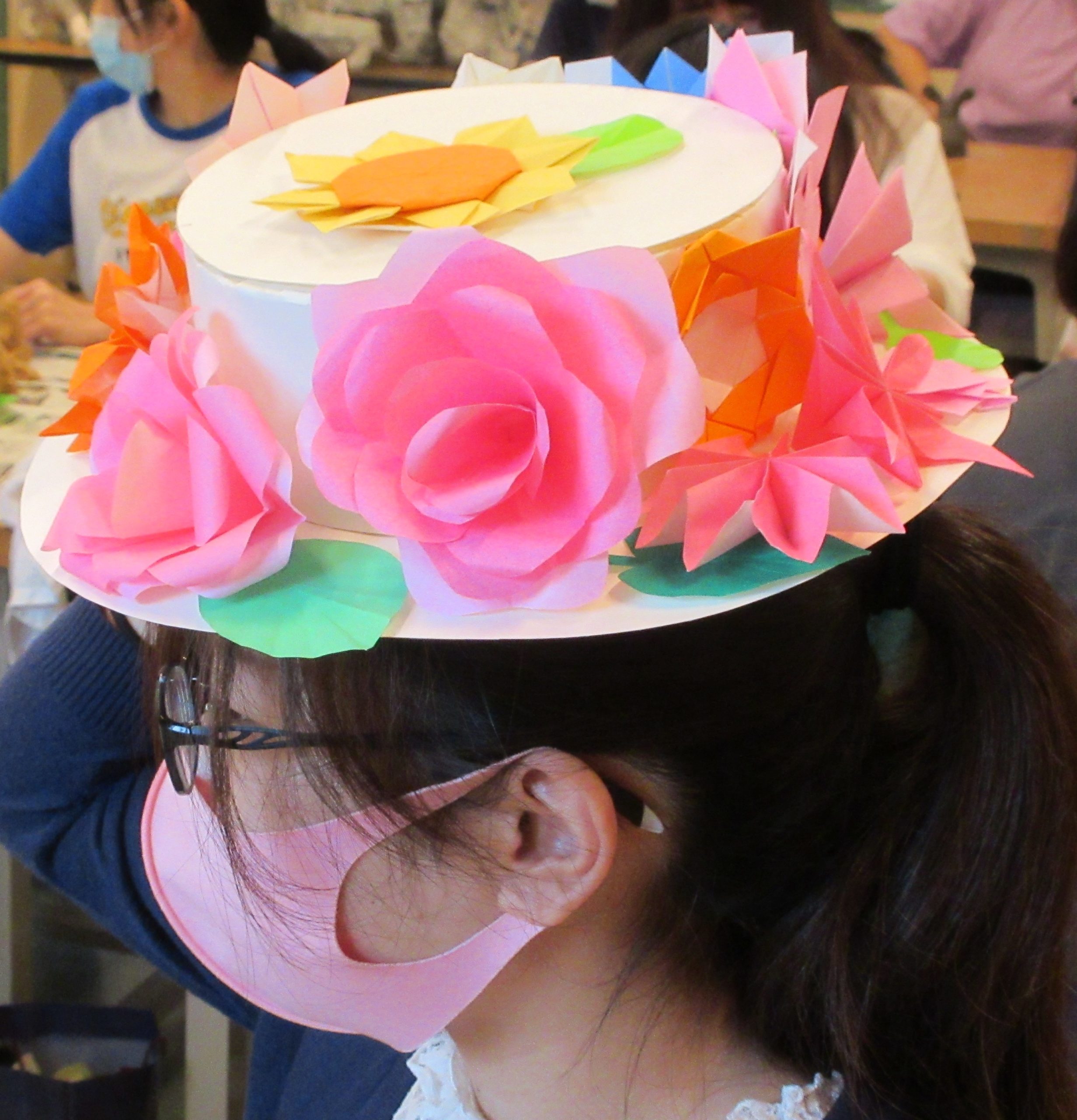 今回の「花飾りのついた帽子」の共同制作を通して、幼児と同様に自身がイメージしたことが実現される過程を通して満足感や充実感を味わうことができました。それぞれの帽子には、テーマ性があり統一感のある作品となっています。互いに、帽子をかぶって作品の違いや良さに気づき、共同制作に対しても意欲を高めることができました。